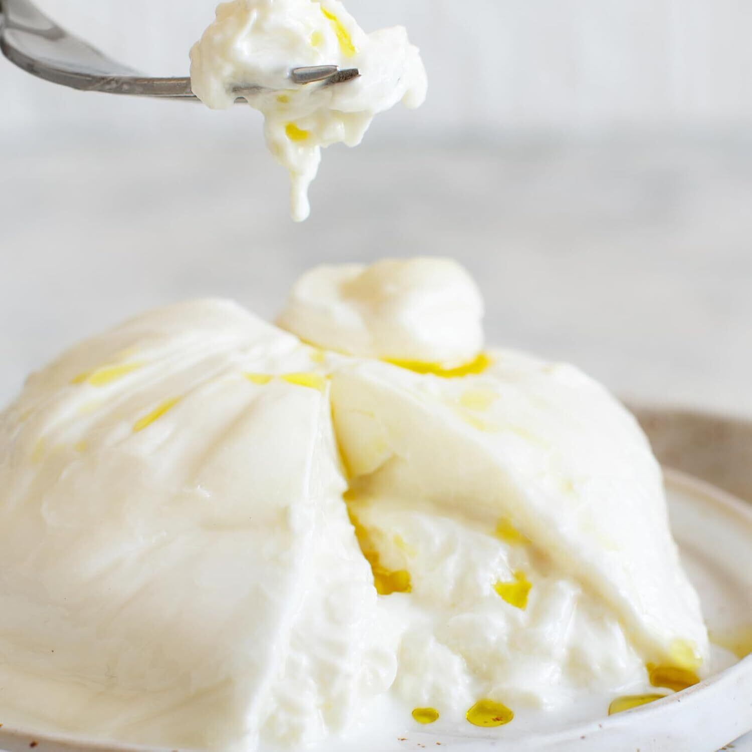 イタリア産ブラータチーズは、南イタリア プーリア州発祥のフレッシュチーズで、その名はイタリア語で「バターのような」を意味します。外側はモッツァレラチーズで包まれ、内部には細かく裂いたモッツァレラと生クリームが詰められており、ナイフを入れると中からとろけるようなクリームが溢れ出します。